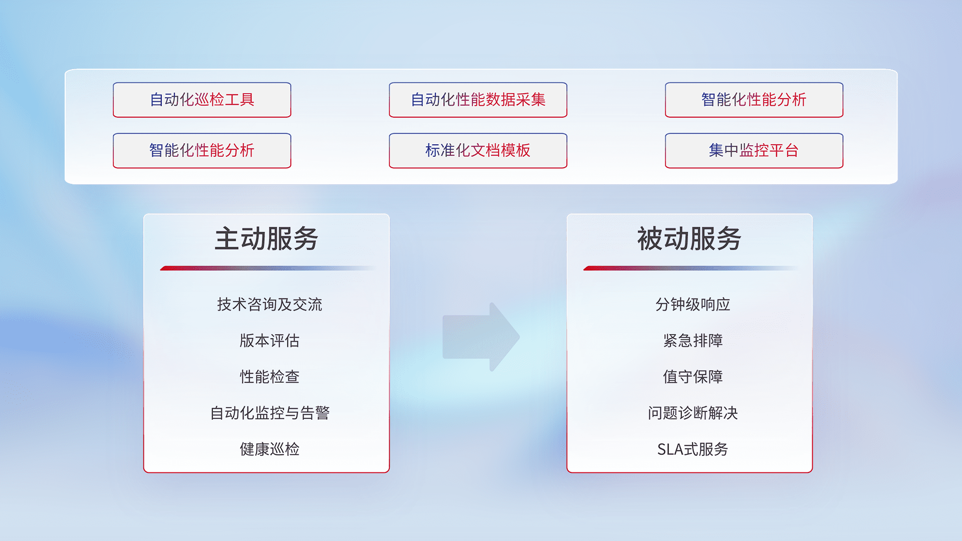 智能化工具和标准化文档,,,保障服务质量,,,,提供主动服务(包含技术咨询、、版本评估、、、性能检查、、、自动化监控与告警、、、健康巡检)和被动服务包含(分钟级响应、、、、紧急排障、、、、值守保障、、、问题诊断解决、、SLA服务)。。。。